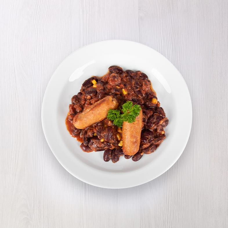 Fazole červená steril 60 %, klobása šunková 24%, rajčata drcená, sůl, pepř, česnek, mouka hladká