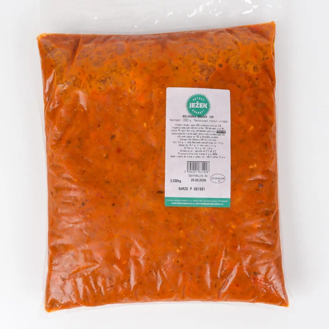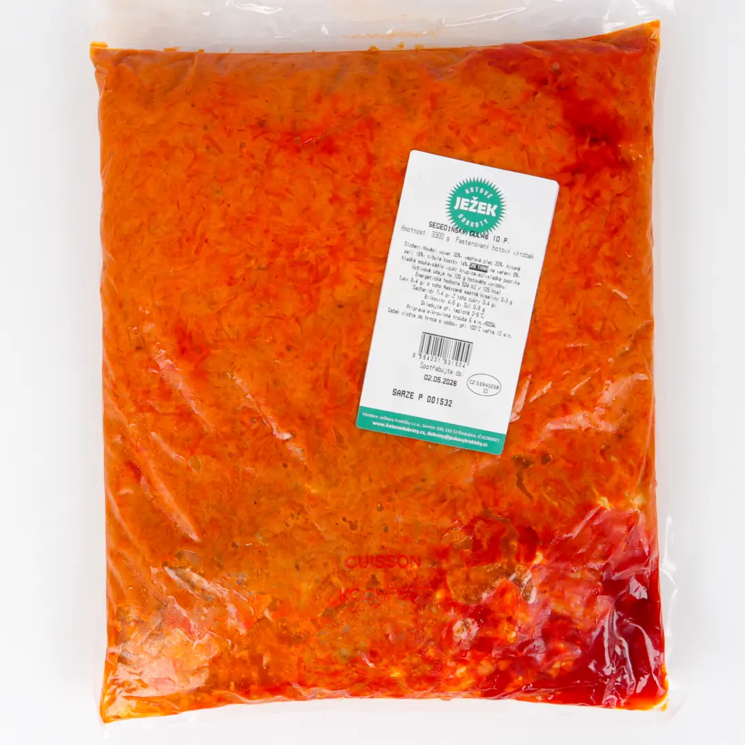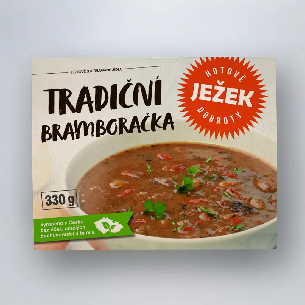 Sterilované jídlo, které má trvanlivost 5 měsíců od data výroby a lze ho skladovat při teplotě do 5 °C.