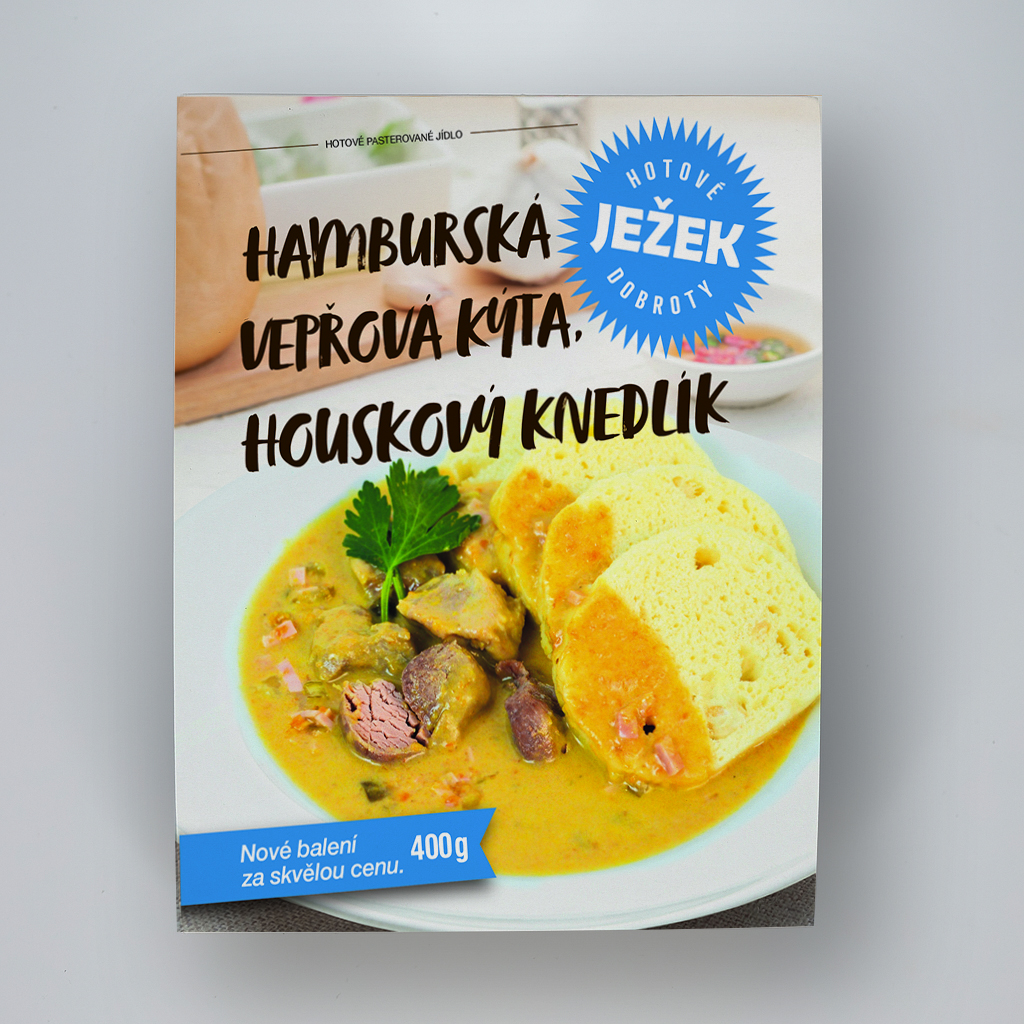 Houskový knedlík (pšeničná mouka, pitná voda, droždí, vejce, jedlá sůl kamenná)34%, vepřová plec 23%, zelenina pod svíčkovou, kyselá okurka, cukr, olej, smetana, šunka, cibule, ocet, mouka hladká, solamyl, jedlá sůl kamenná, slanina, hořčice (pitná voda, hořčičné semínko, ocet kvasný lihový, cukr, jedlá sůl kamenná, směs koření, kurkuma), divoké koření.