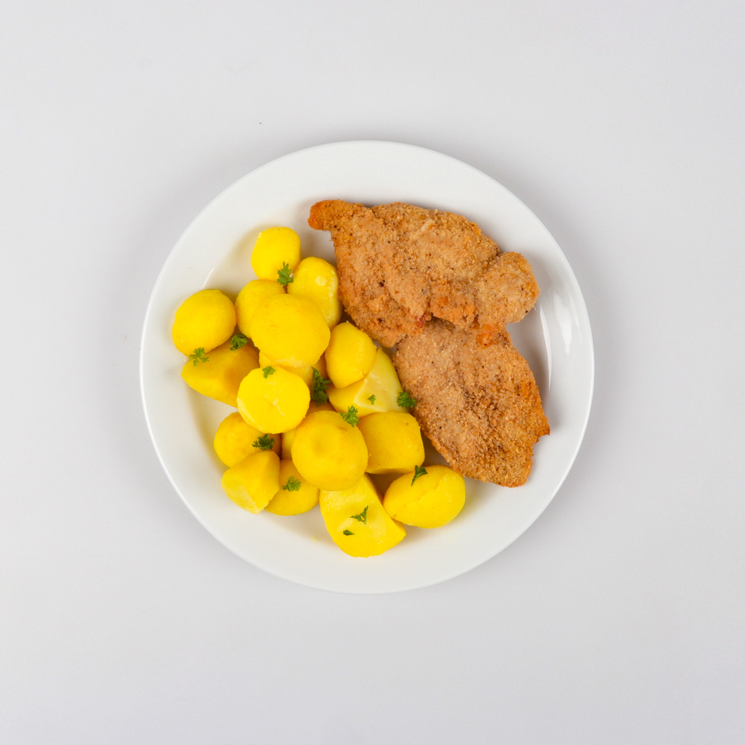 Brambory 64 %, kuřecí prsa 18 %, strouhanka 5 %, olej slunečnicový 5 %, vejce 2 %, mouka pšeničná 2 %, máslo 2 %, sůl