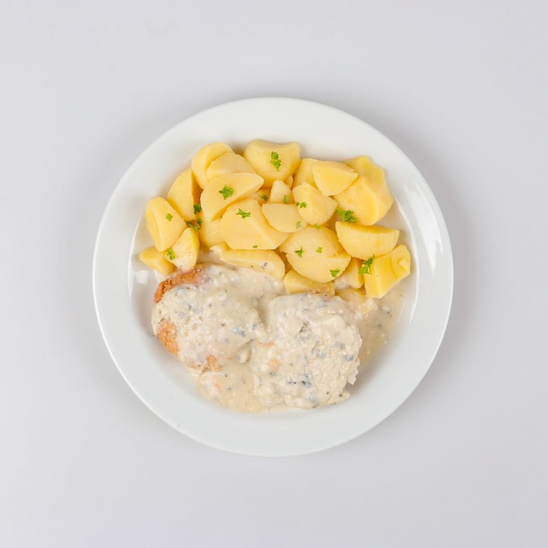 Květákové placičky se sýrovou omáčkou a vařeným bramborem.