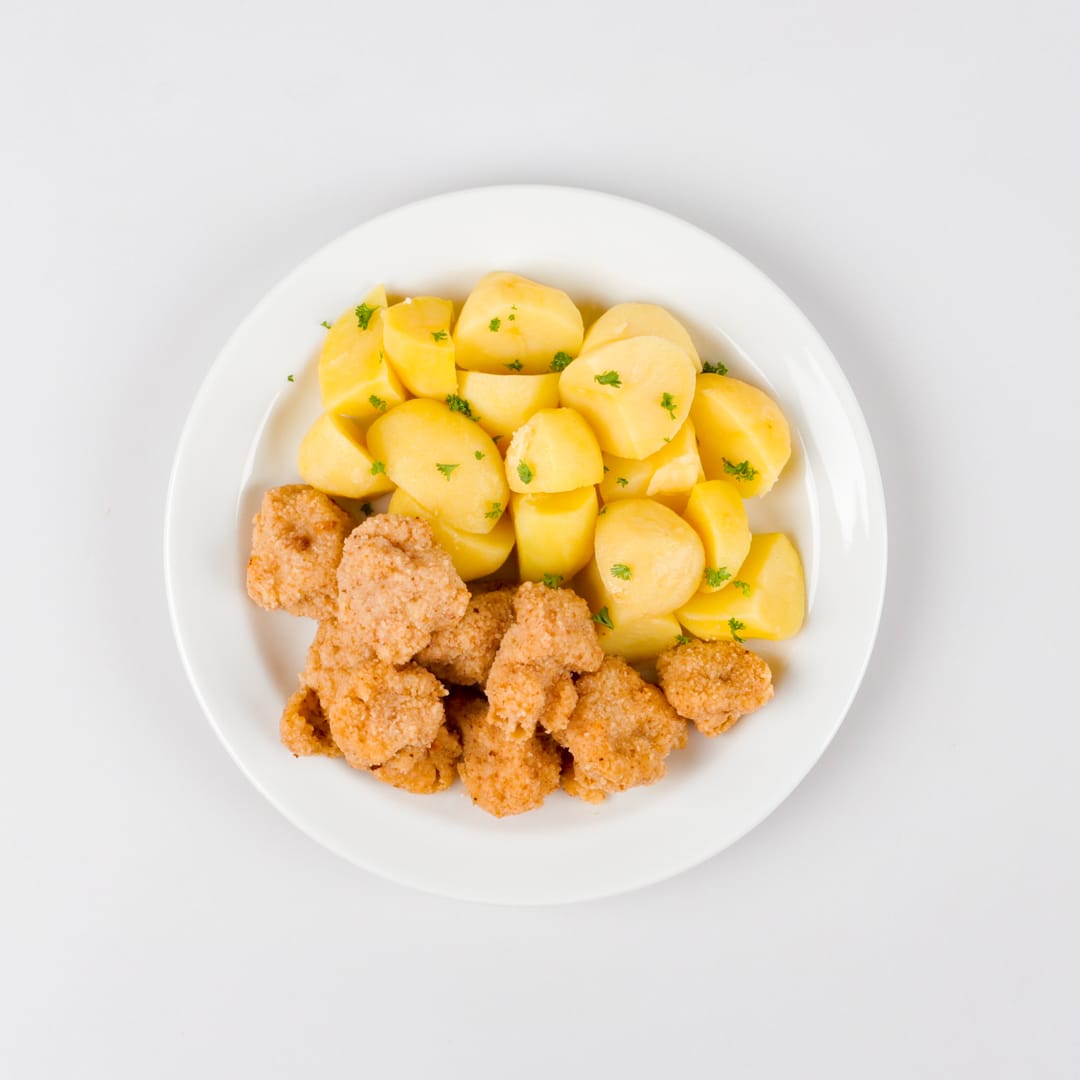 Brambory 54 %, obalovaný květák (květák, strouhanka, olej slunečnicový, sůl) 39 %, olej slunečnicový 5 %, máslo 2 %, sůl