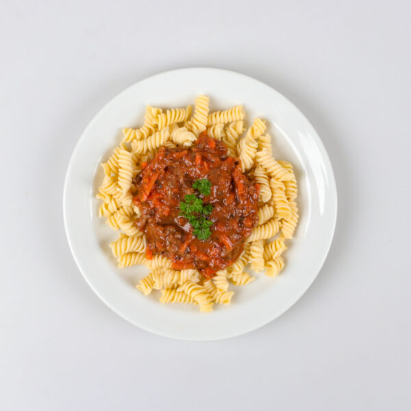 Rajská omáčka s masovými kuličkami, rýžové fusilli